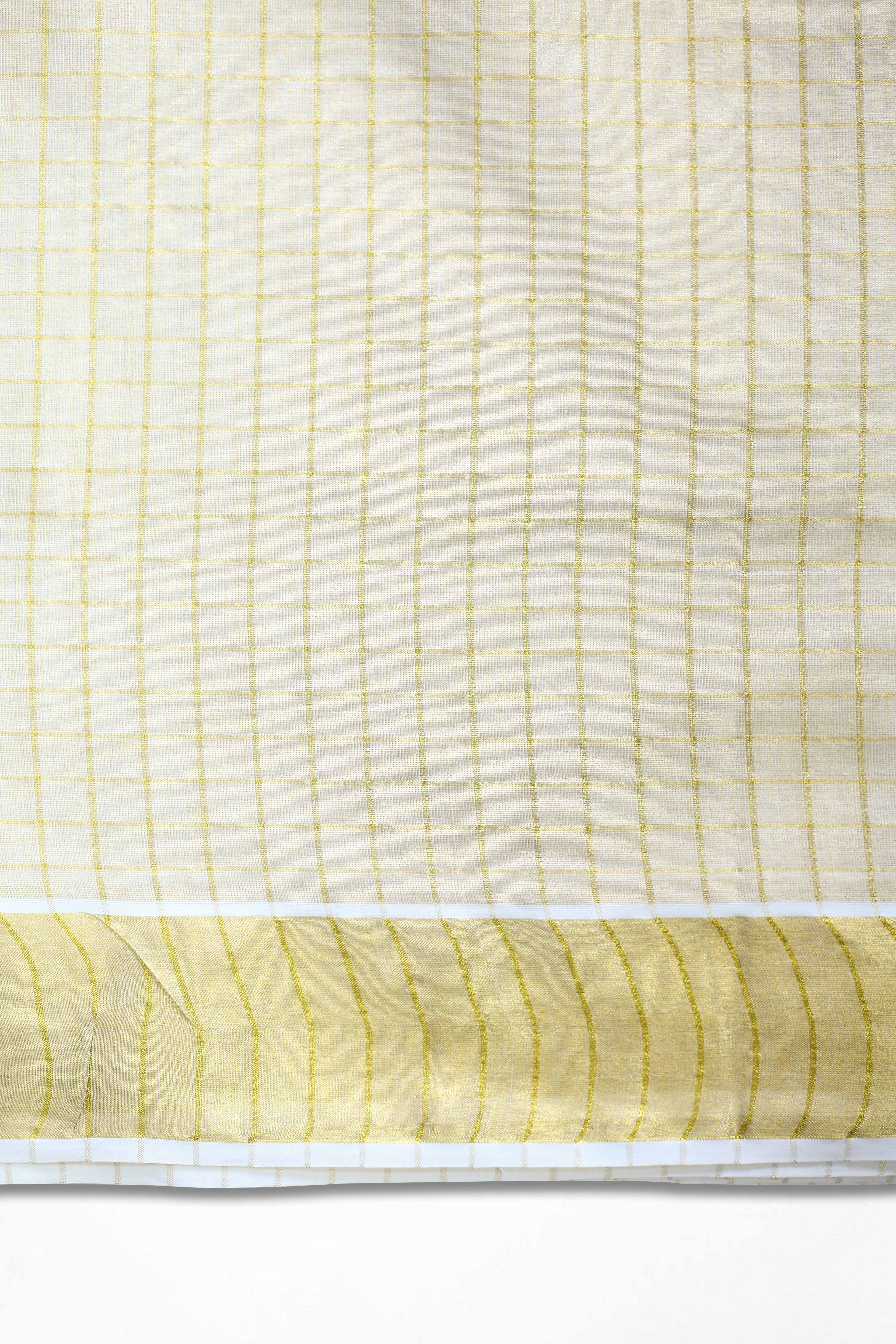 Embrace timeless tradition with this Kerala tissue saree featuring a classic check design and an elegant golden border. Comes with a matching blouse piece, making it perfect for festive and cultural occasions.