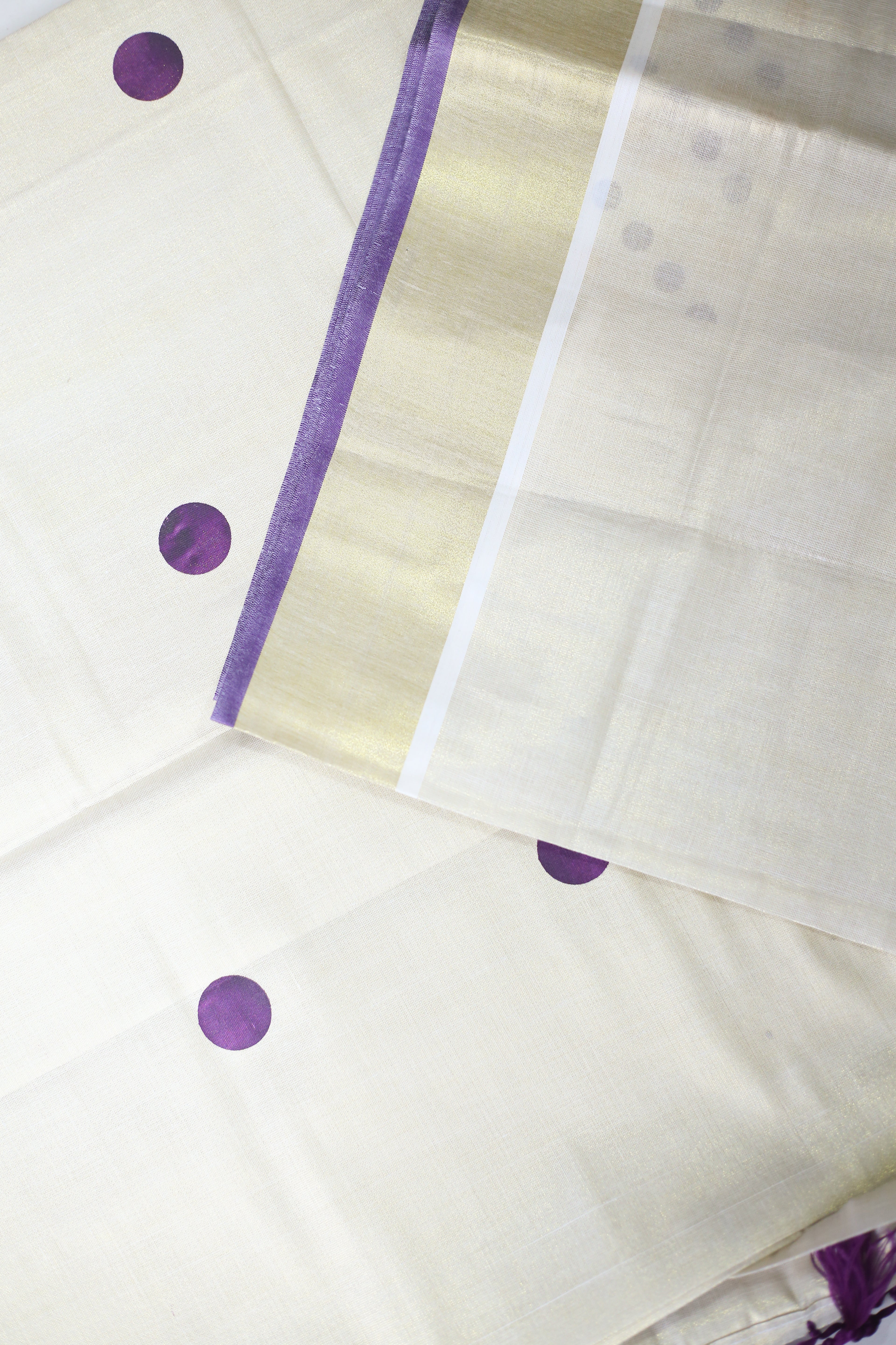 Kerala Set Saree – Dot Print with Golden Kasavu & Tassels